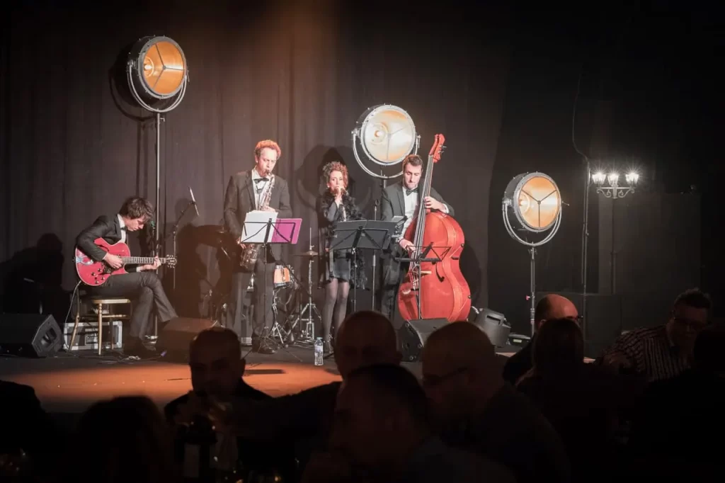 Notre quintet de jazz swing, accompagné de trois danseurs professionnels, a recréé l’atmosphère raffinée et entraînante des années 30. Intégrée à une convention de deux jours, cette soirée à thème illustre notre savoir-faire dans la création d’un thème pour soirée entreprise alliant musique live et animation artistique haut de gamme.